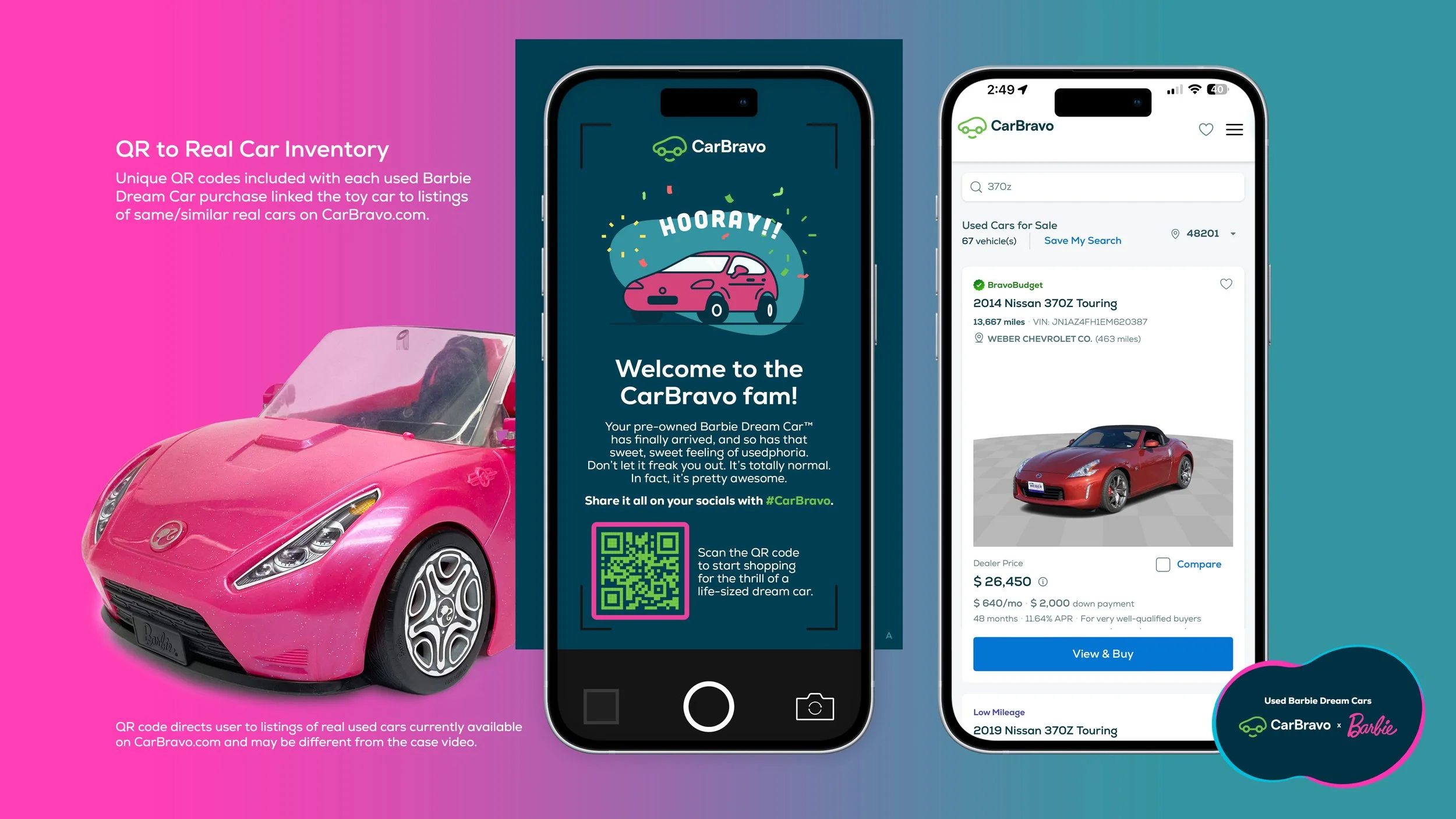 America’s newest used car brand, CarBravo, insists on fair and honest prices for all used cars—yes, even toy ones. With a modest budget and the green light from Mattel, we bought as many overpriced used Barbie Dream Cars as we could and listed them on our commerce site (you can get to it here) designed to mirror the real CarBravo.com. So you could search, filter, and buy them at fair and honest prices. Just like our REAL full-size vehicles.